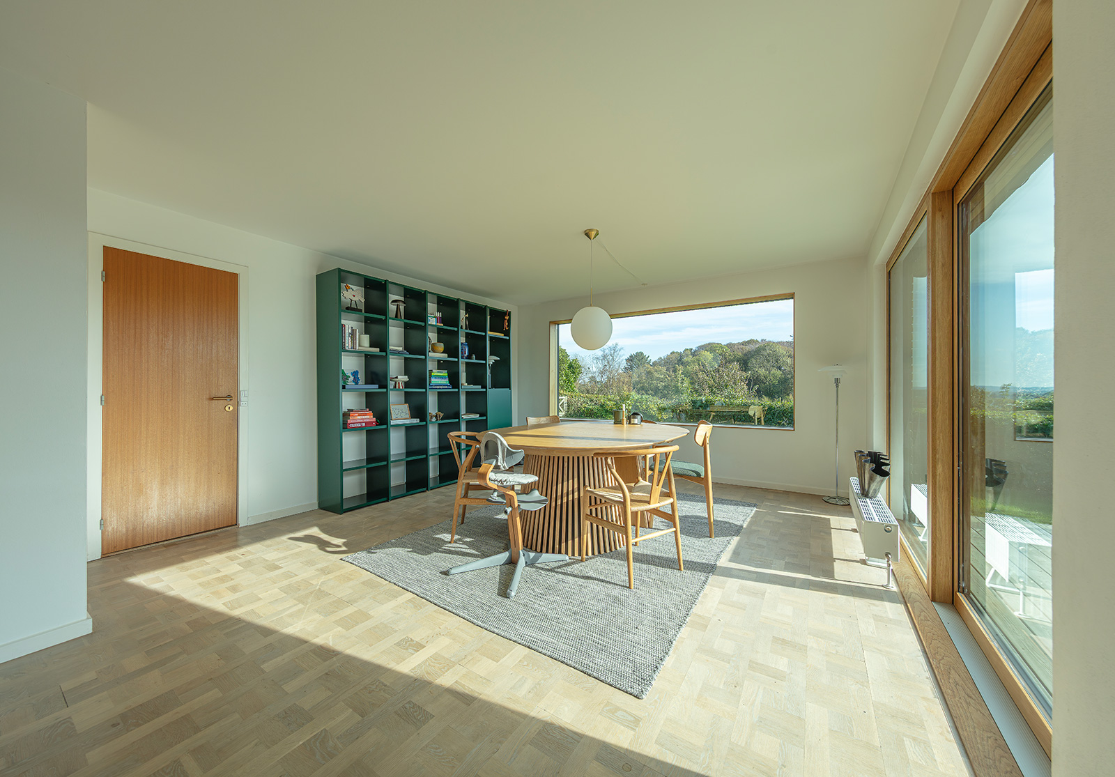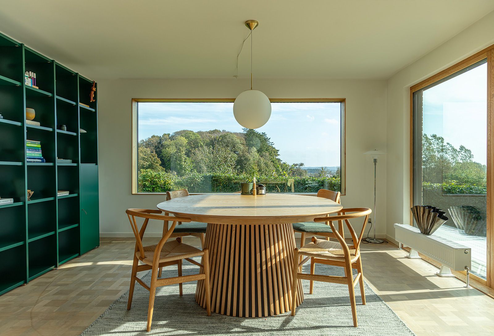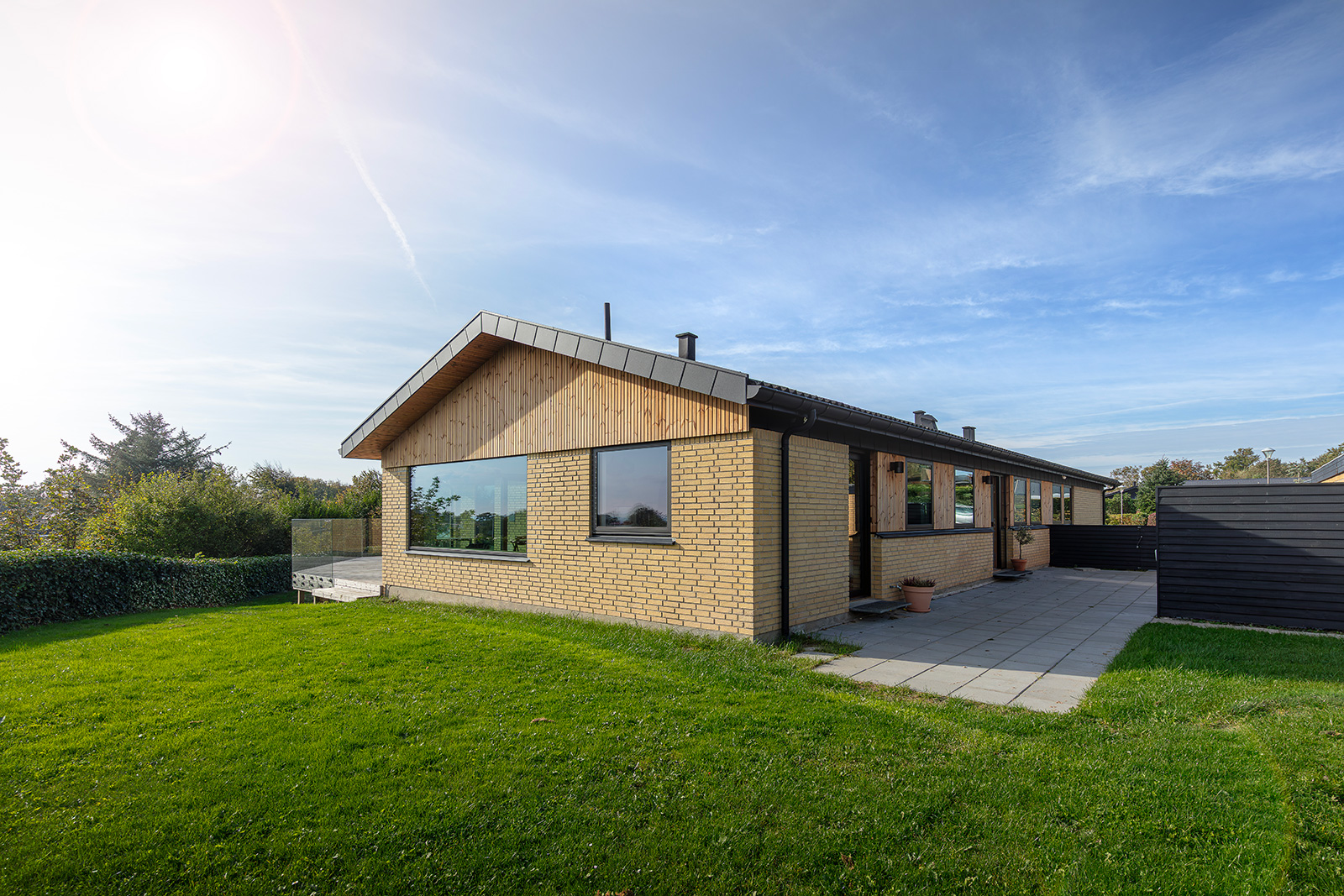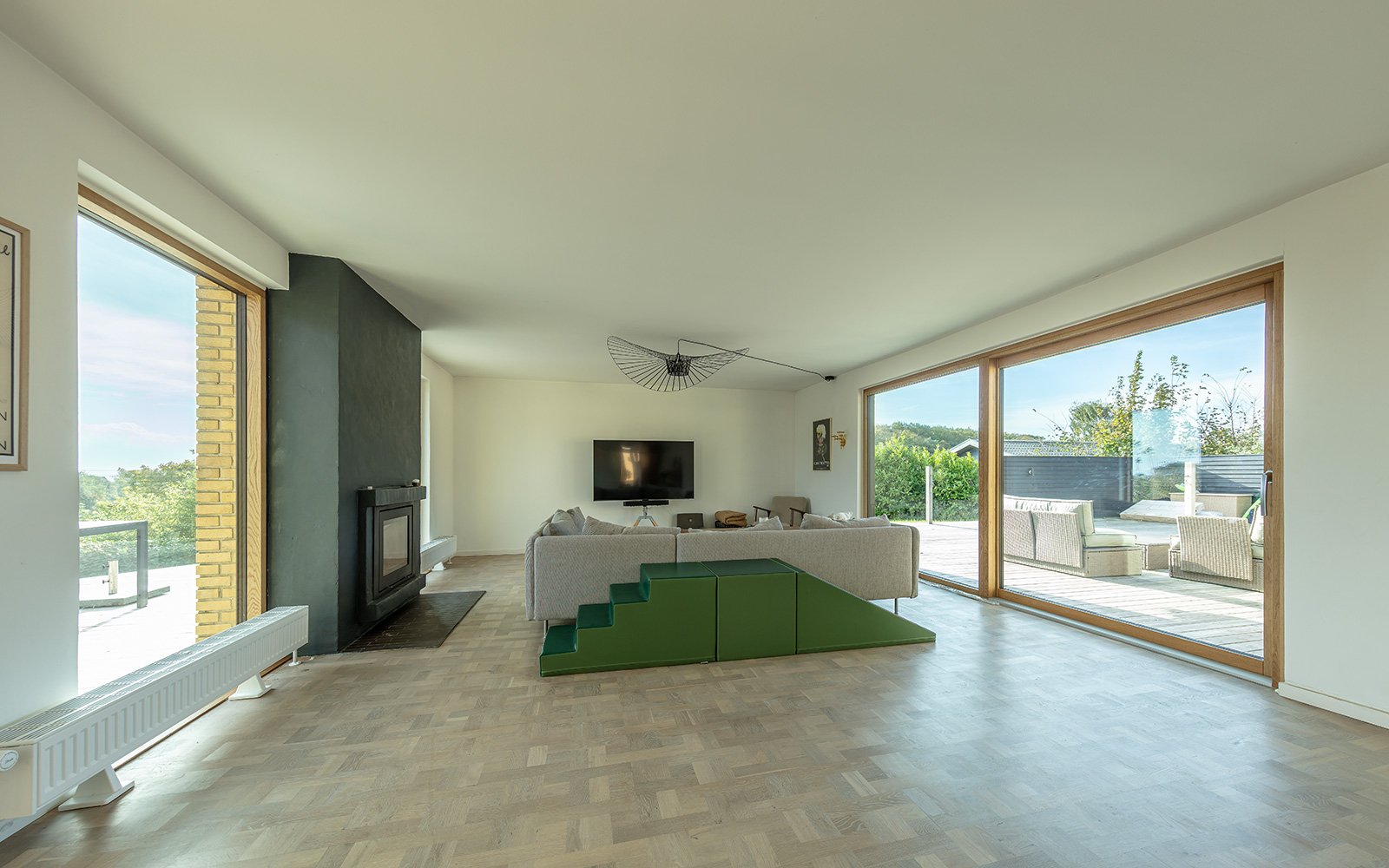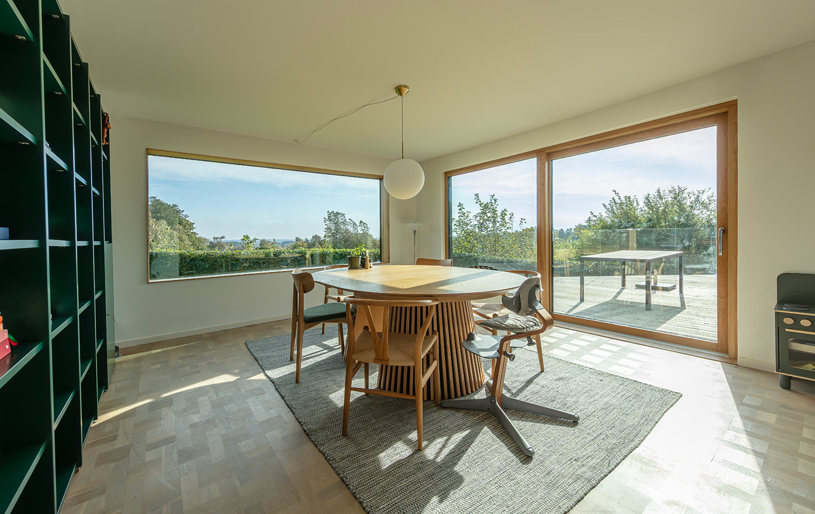 En klassisk 70’er villa, som har fået en eksklusiv vinduesopgradering. Smukke egetræsløsninger har skabt et varm udtryk og åbnet op for en smuk udsigt i stuen.