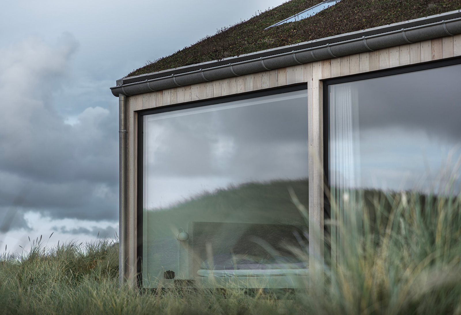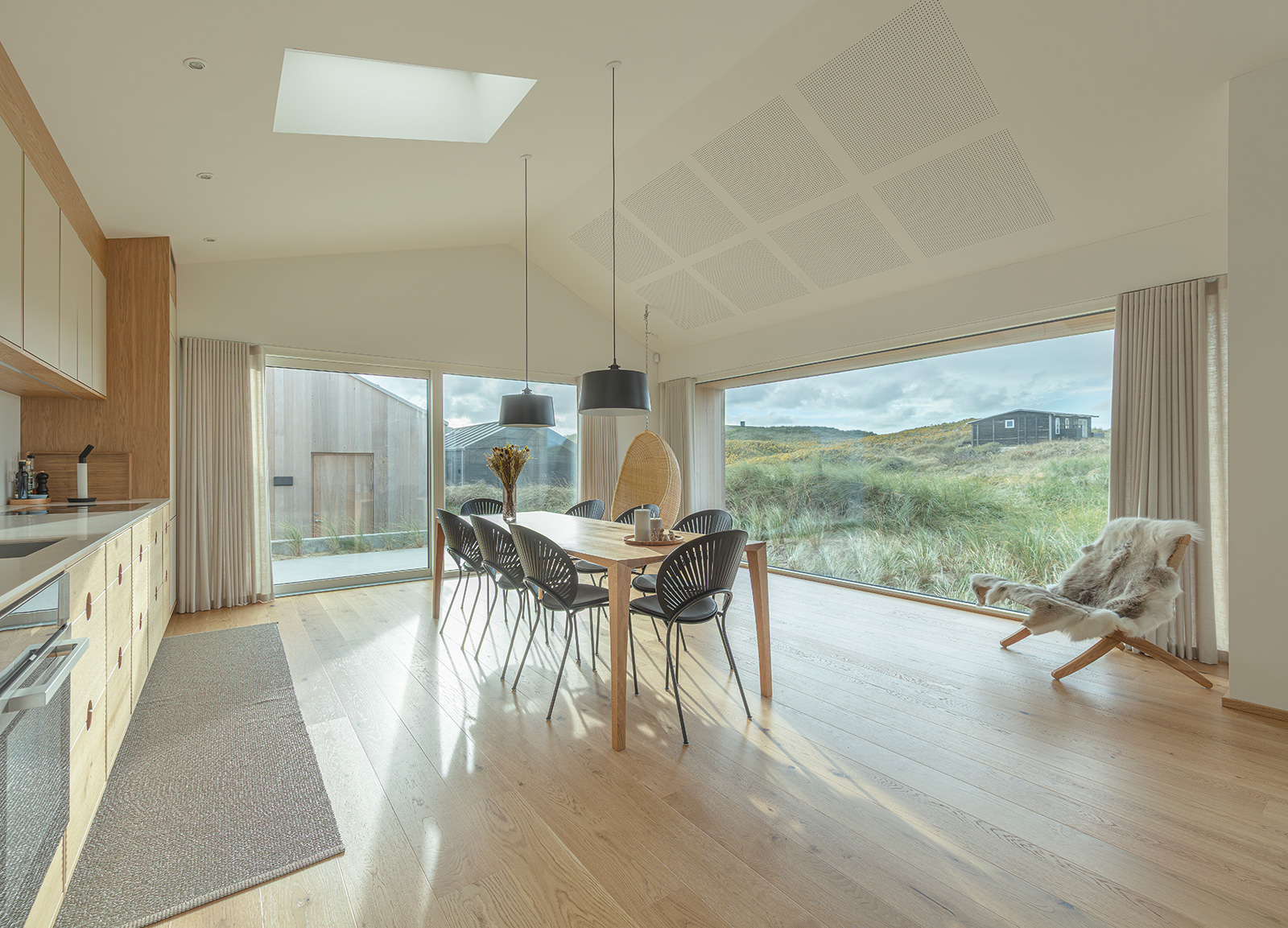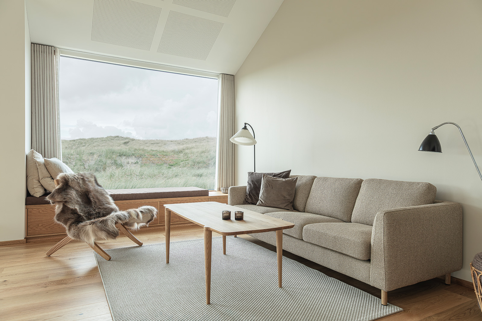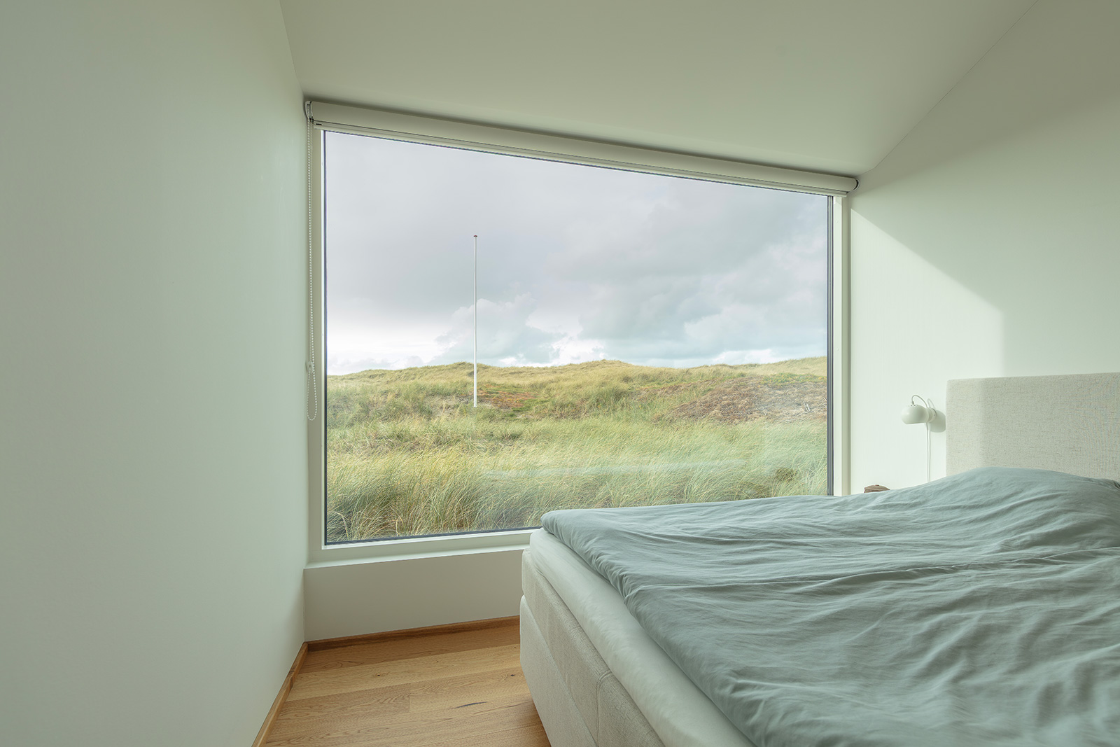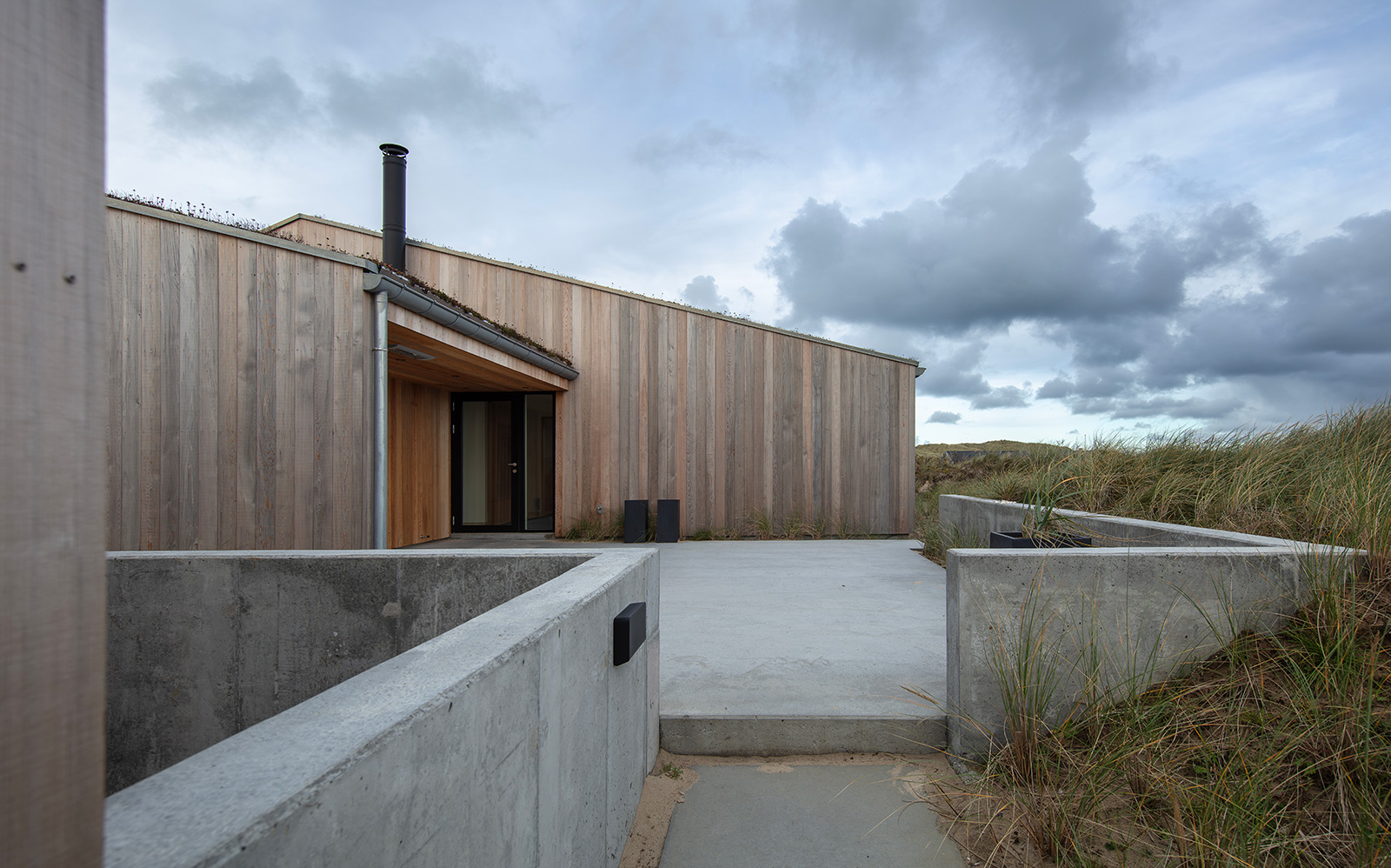 Et smuk arkitekttegnet sommerhus beliggende helt ude i klitterne. Store smukke vinduespartier, der inviterer strandsandet og marramgræsset helt indenfor.