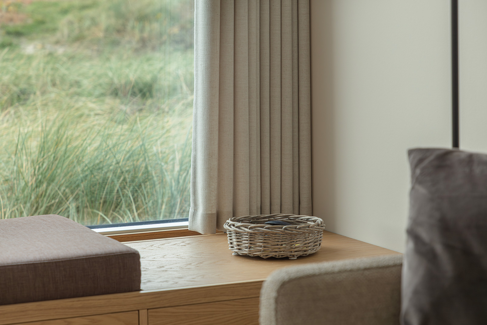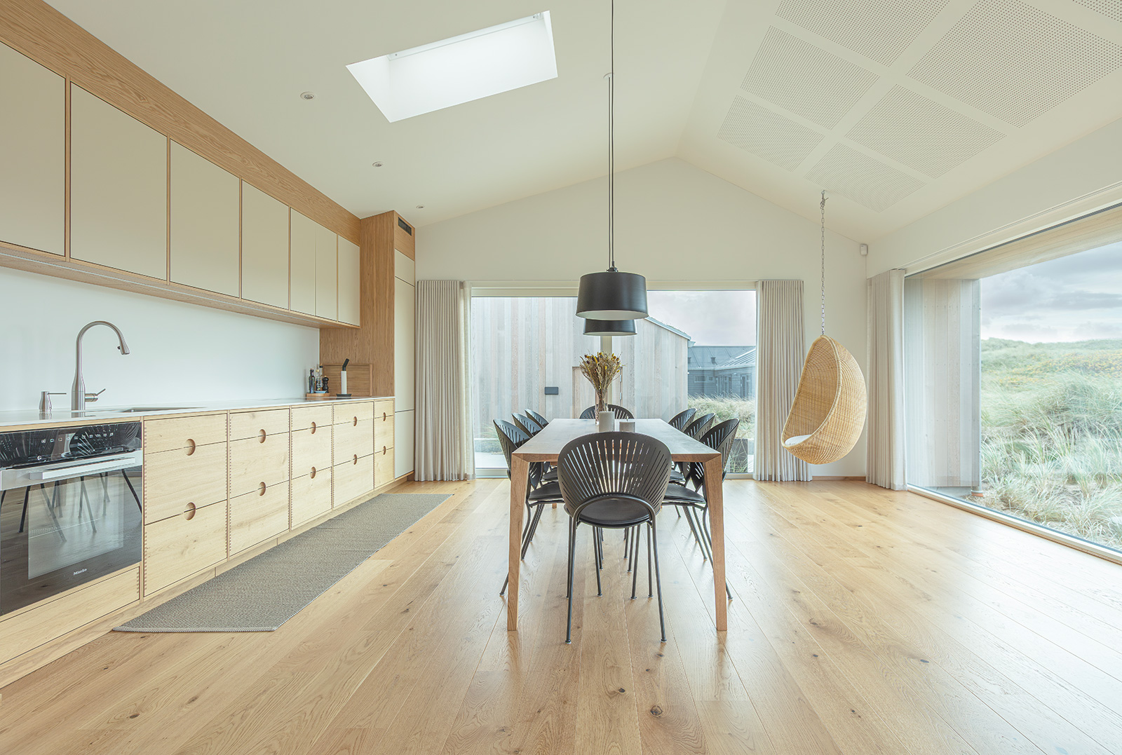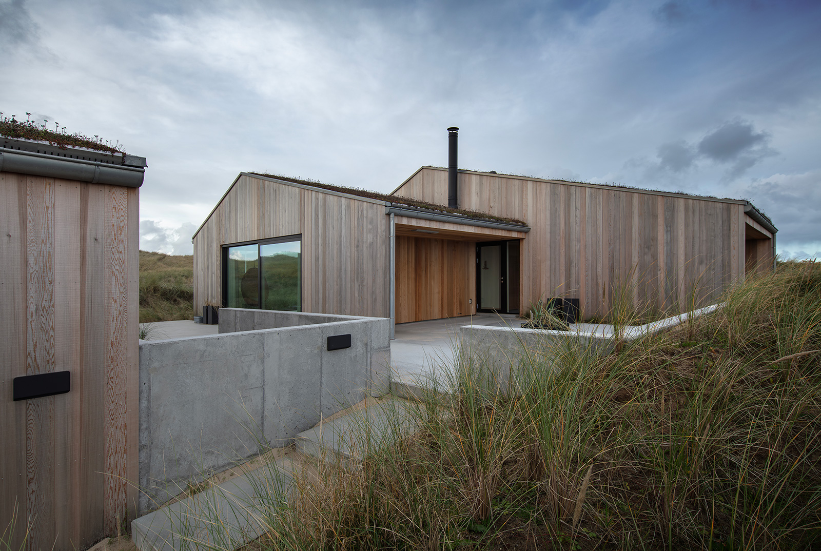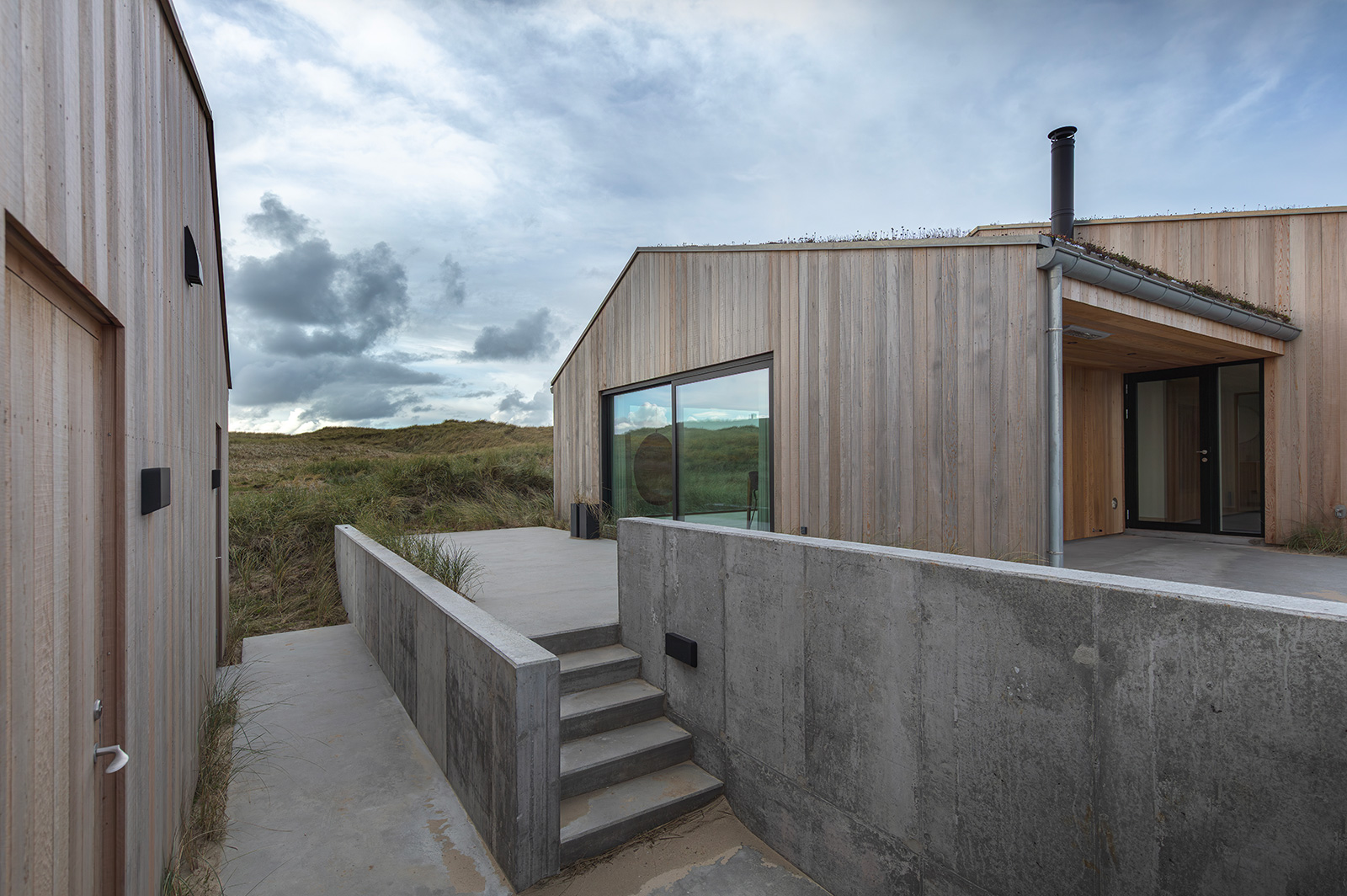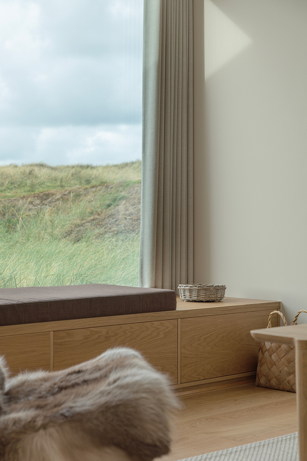 Et smuk arkitekttegnet sommerhus beliggende helt ude i klitterne. Store smukke vinduespartier, der inviterer strandsandet og marramgræsset helt indenfor.